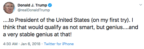 "extremely stable genius" on May 23, 2019 (after a contentious meeting with Democrats