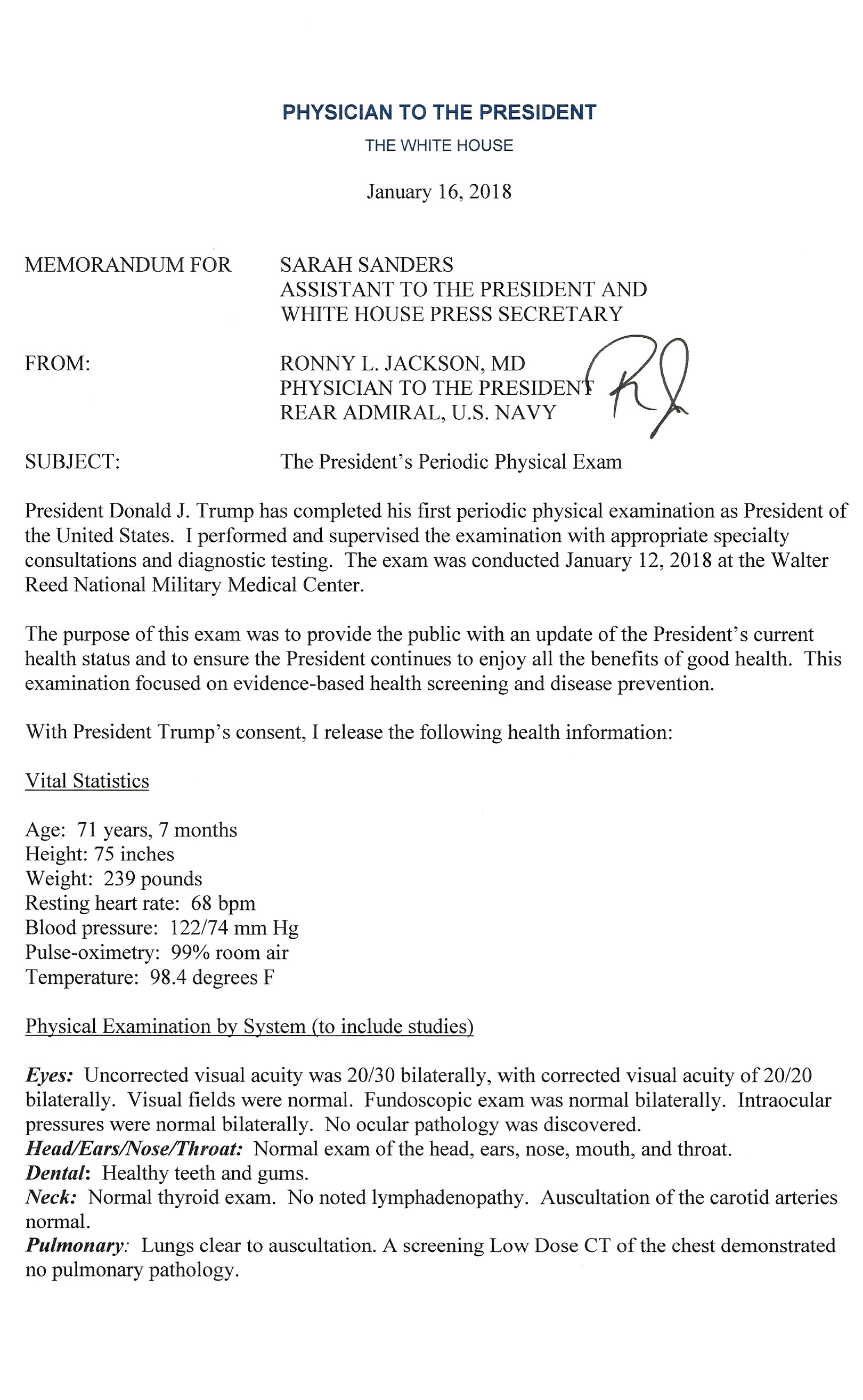 This is the publicly-released report of President Trump's physical examination of January 12, 2018.