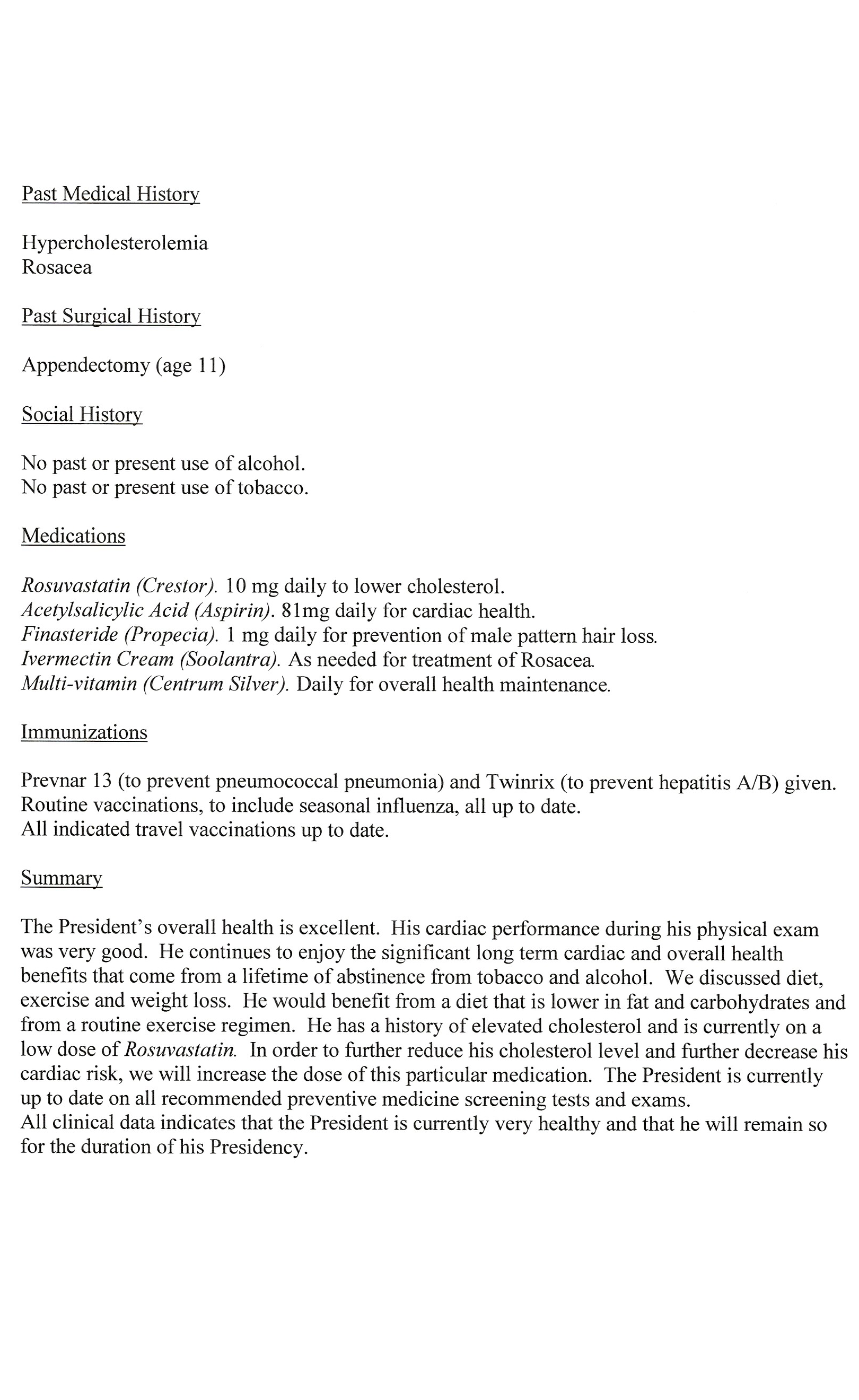 While minor in themselves, these issues are a reminder that, without defined standards for the Presidential medical examination, the public will never truly know the President's state because it is just so simple to tailor the message as desired, by omitting information. Here we see a clear bias toward suppressing data showing even a hint of abnormality.The other major fault is the lack of formal sleep assessment -- a pretty large lacuna.