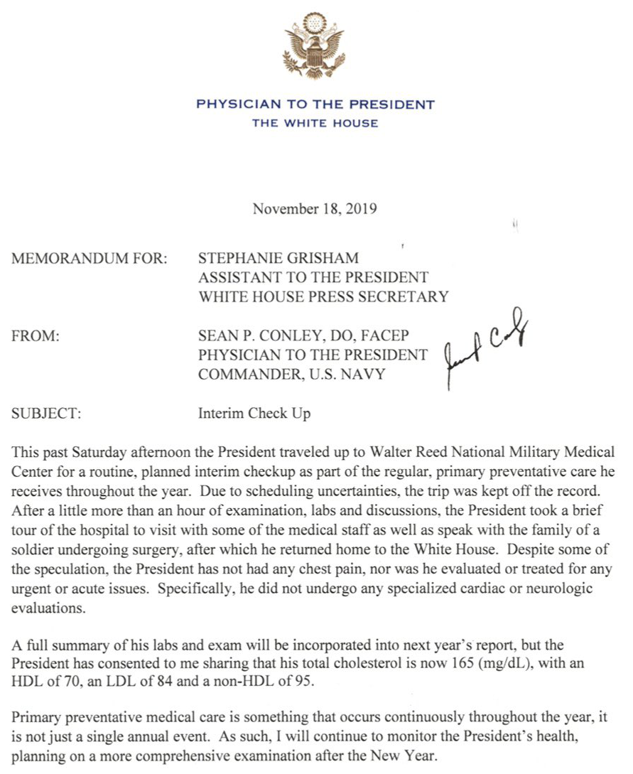 Comment: The document is unacceptably vague about dates. For example, it is not possible to determine on what date between Nov. 2019 and April 2020 the President's weight was measured. The document is archived here --> MORE |