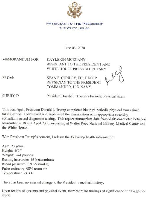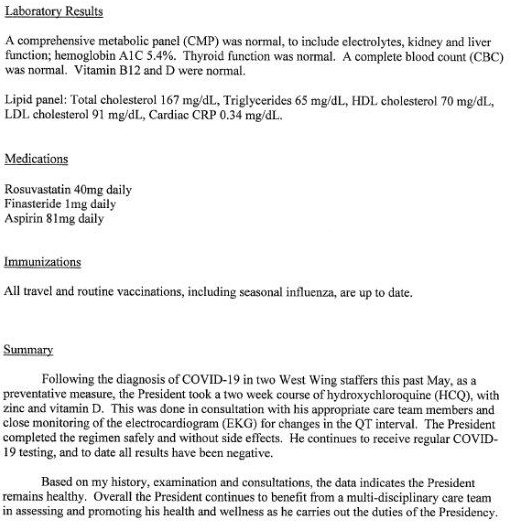 Comment: The document is unacceptably vague about dates. For example, it is not possible to determine on what date between Nov. 2019 and April 2020 the President's weight was measured. The document is archived here --> MORE |