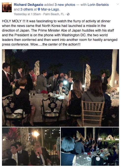 During an outdoor dinner with Japanese Prime Minister Shinzo Abe on Feb. 12, 2017,